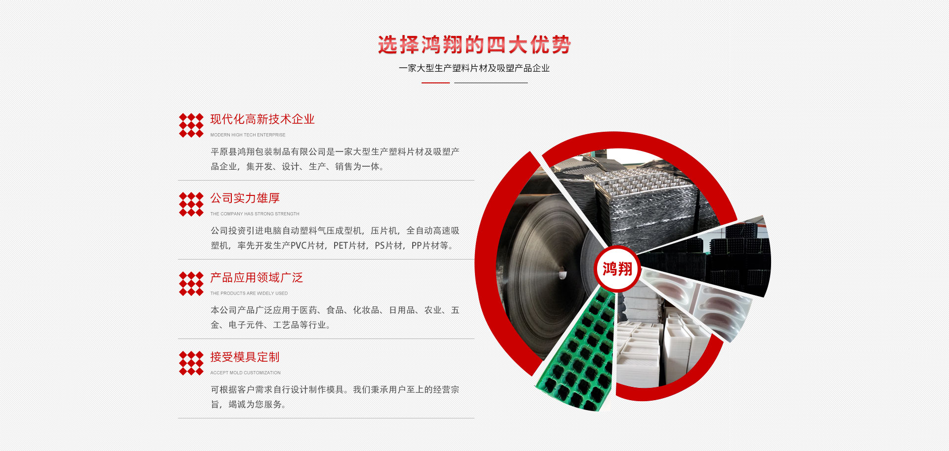 平原縣鴻翔包裝制品有限公司是一家大型生產塑料片材及吸塑產品企業,本公司投資引進電腦自動塑料氣壓成型機,壓片機,全自動高速吸塑機,率先開發生產PVC片材,PET片材,PS片材,PP片材等,鴻翔是國內先進的生產廠家之一。本公司產品廣泛應用于醫藥、食品、化妝品、日用品、農業、五金、電子元件、工藝品等行業,也可根據客戶需求自行設計制作模具。本公司技術力量雄厚,生產設備工藝先進。我們秉承用戶至上的經營宗旨,竭誠為您服務。